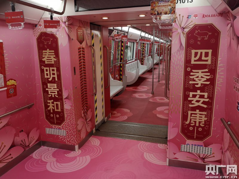 大連地鐵上線“2019金豬納!敝黝}車廂(央廣網(wǎng)發(fā) 宮文 攝)