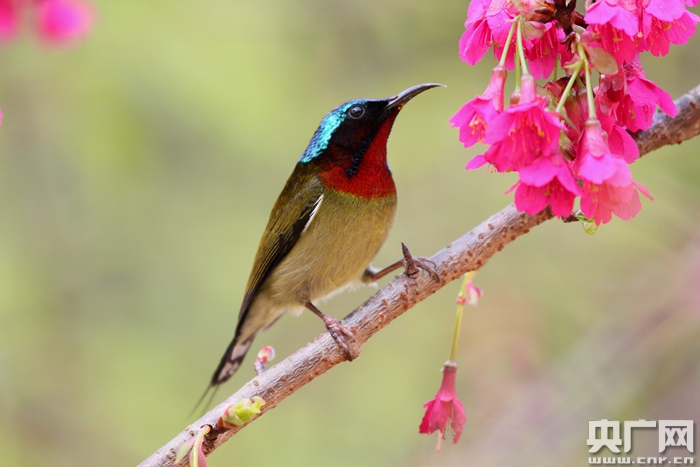央廣網福州1月30日消息(記者張子亞)眼下,各種櫻花正在福建各地漸次絢爛綻放。花叢間,偶爾響起幾聲細碎鳥鳴,幾只僅有食指大小的纖弱小鳥在枝頭上下翻飛吸食花蜜,或倒轉金勾,或振翅懸停。粉色、赭紅、金屬綠、橄欖黃……花與鳥的明艷色彩構成一幅流動的美麗花鳥圖。每天,在福州森林公園櫻花園附近的水池邊,這樣的畫面都會謀殺無數長槍短炮的內存。