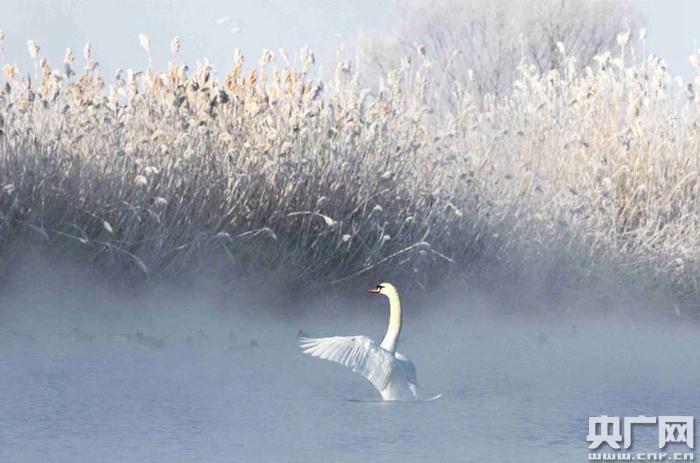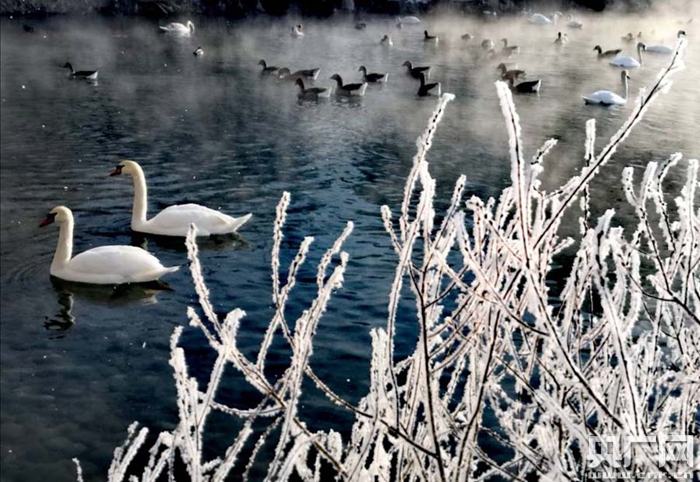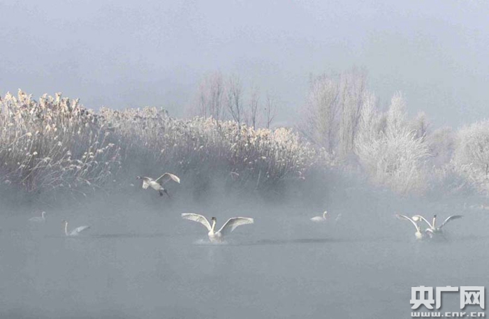 春節(jié)期間,伊犁河谷天氣晴好,一場霧凇裝扮下的伊寧縣天鵝泉濕地公園,滿樹晶瑩剔透,湖面波光粼粼、霧氣縹緲,數(shù)百只天鵝在金色的晨光沐浴下覓食嬉戲、翩翩起舞,原生態(tài)版本的芭蕾舞劇“天鵝湖”在這里夢幻上演,銀色的童話世界讓來自全國各地的游客和攝影師如醉如癡。
