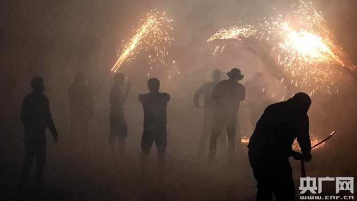 2月13日晚,西坪鎮(zhèn)街頭煙火彌漫中的鬧新春場景(央廣網記者 陳屹 攝)