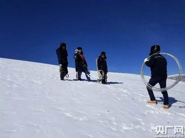 運檢班員在海拔4850米的哈秀山上攜帶安全工器具徒步趕往檢修保電現(xiàn)場(央廣網(wǎng)發(fā) 國網(wǎng)青海省電力公司供圖)