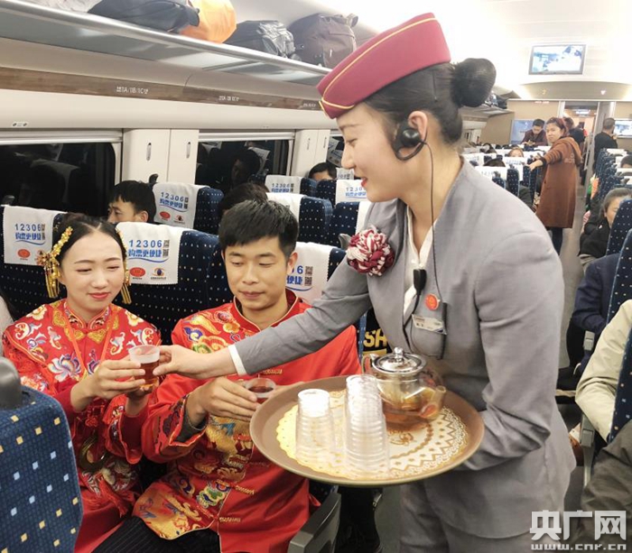 此情此景,列車長蔣娜和動姐們忙碌了起來,倒水、沏茶、送祝福,和旅客一起祝福新郎新娘新婚快樂,白頭偕老。行進(jìn)的動車上,充滿祝福和愛意。