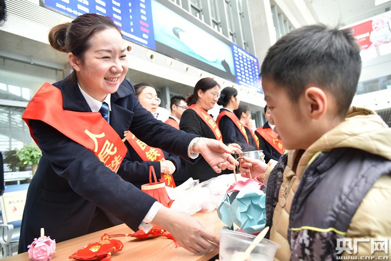 黨團(tuán)員們還為旅客發(fā)放花燈,并送上一碗碗熱氣騰騰的湯圓!疤钗殷@喜了,元宵節(jié)能在高鐵站看到歌舞表演,還能吃上熱乎乎的湯圓,暖到心窩里了!闭郎(zhǔn)備乘坐G1680次去杭州的王女士接過(guò)黨員志愿者端來(lái)的香甜可口的湯圓,感慨萬(wàn)分。