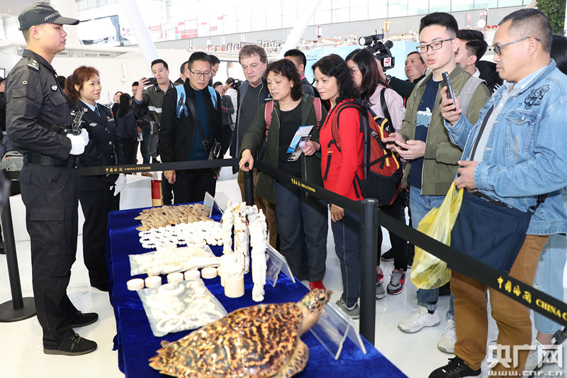 旅客在海關(guān)查獲的走私象牙制品展臺(tái)前駐足停留,學(xué)習(xí)瀕危野生動(dòng)植物保護(hù)知識(shí)。池兆恩 攝