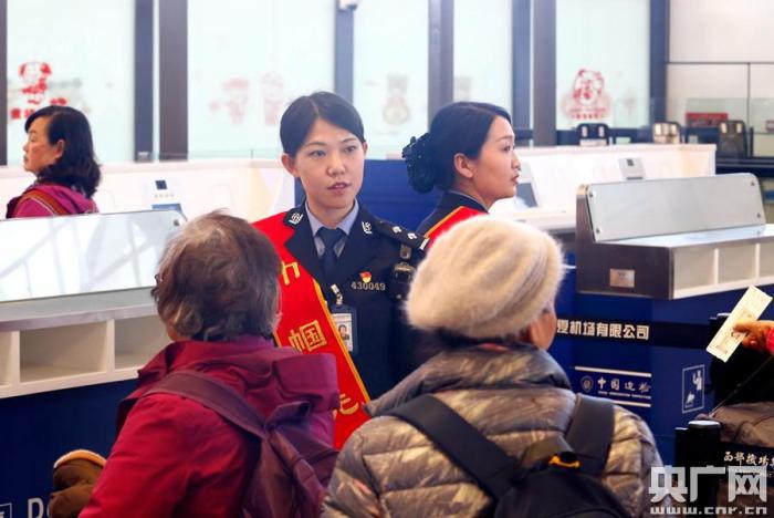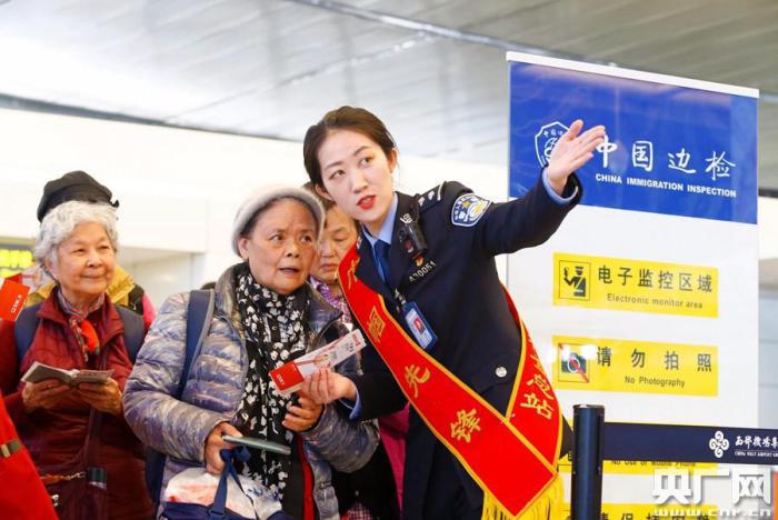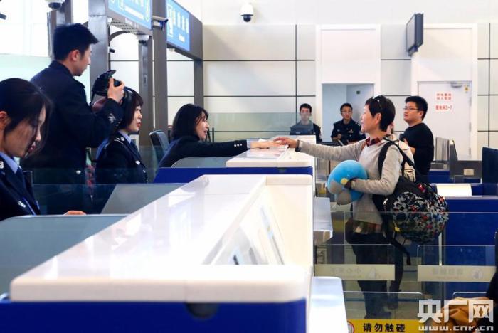 正在引導(dǎo)出境旅客有序通關(guān)(央廣網(wǎng)發(fā) 劉玉飛 鄧子晗提供)