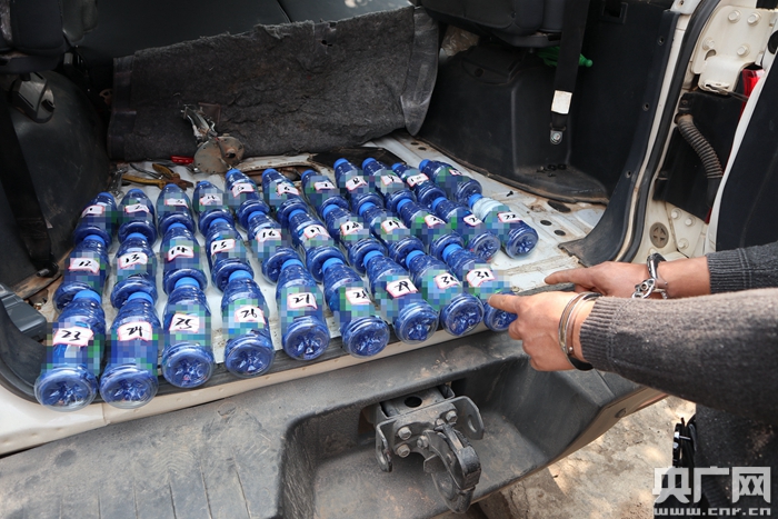 3月9日12時(shí)許,該支隊(duì)軍賽邊境檢查站執(zhí)勤民警在查緝現(xiàn)場(chǎng)對(duì)一輛從孟定開往臨滄方向的越野車進(jìn)行例行檢查時(shí),發(fā)現(xiàn)該車駕車男子面對(duì)詢問神情恍惚、十分緊張,且答非所問,男子的一系列行為引起了執(zhí)勤民警的高度警覺。執(zhí)勤民警遂將該車引導(dǎo)至重點(diǎn)檢查區(qū)域進(jìn)行詳細(xì)檢查,經(jīng)檢查發(fā)現(xiàn)該車后備箱內(nèi)螺絲有擰動(dòng)的痕跡,通過仔細(xì)拆裝檢查,當(dāng)場(chǎng)從該車油箱內(nèi)查獲用藍(lán)色飲料瓶散裝的毒品甲基苯丙胺(冰毒)31瓶,共計(jì)9.49公斤,犯罪嫌疑人被當(dāng)場(chǎng)抓獲。