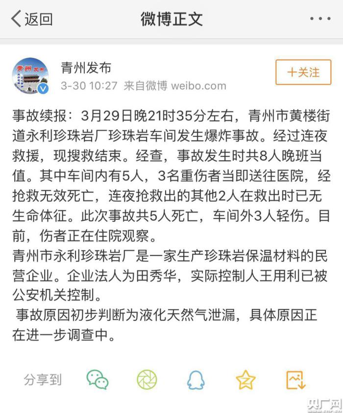 央廣網(wǎng)濰坊3月30日消息(記者劉海奎)記者從山東省青州市政府新聞辦官方微博@青州發(fā)布了解到,3月29日晚21時35分左右,青州市黃樓街道永利珍珠巖廠珍珠巖車間發(fā)生爆炸事故。經(jīng)過連夜救援,現(xiàn)搜救結(jié)束。經(jīng)查,事故發(fā)生時共8人晚班當值。其中車間內(nèi)有5人,3名重傷者當即送往醫(yī)院,經(jīng)搶救無效死亡,連夜搶救出的其他2人在救出時已無生命體征。此次事故共5人死亡,車間外3人輕傷。目前,傷者正在住院觀察。