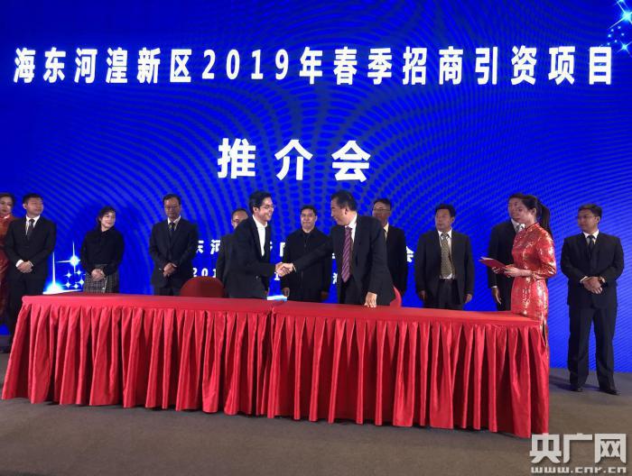 海東工業(yè)園區(qū)管委會專職副主任王占恩與近期入駐河湟新區(qū)的企業(yè)負(fù)責(zé)人簽約(央廣網(wǎng)記者 劉澤耕 攝)