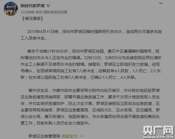 事發(fā)于當(dāng)晚21時(shí)40分許,深圳市羅湖區(qū)桂園、黃貝片區(qū)遭遇瞬時(shí)強(qiáng)降雨,短時(shí)爆發(fā)的洪水沖入正在作業(yè)的暗渠。22時(shí)10分、22時(shí)55分先后接到我區(qū)兩處清淤作業(yè)工人躲避不及被雨水沖走的警情。接警后,羅湖區(qū)立即組織全力救援。經(jīng)現(xiàn)場(chǎng)確認(rèn),在西湖賓館段施工處有7人被沖走,經(jīng)解救有4人獲救,1人死亡,2人失聯(lián);在東湖公園段施工處有5人被沖走,已確認(rèn)1人死亡,4人失聯(lián)。