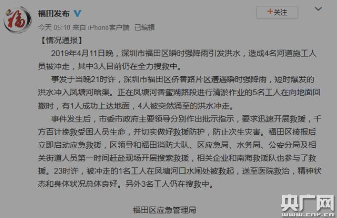 2019年4月11日晚,深圳市福田區(qū)瞬時(shí)強(qiáng)降雨引發(fā)洪水,造成4名河道施工人員被沖走,其中3人目前仍在全力搜救中。