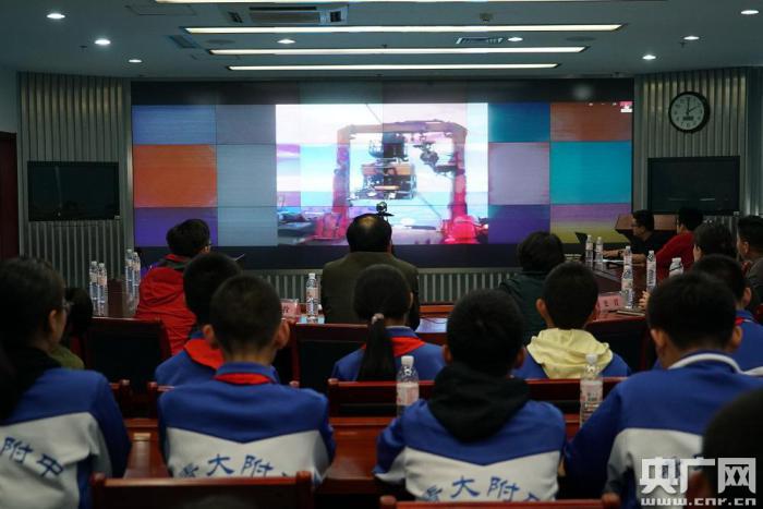 在北海局應急指揮廳內(nèi),來自青大附中的同學們正在聚精會神地通過視頻連線,觀看科考隊員們布放潛水器“海龍Ⅲ”,準備開始本航次第三航段第七次下潛作業(yè)。船上科考隊員介紹,本航段,在母船“大洋一號”船的配合下,“海龍Ⅲ”搭載多種自主研發(fā)監(jiān)測探查針及取樣設(shè)備,現(xiàn)已完成了六次下潛作業(yè),原位觀測到海底大量大型底棲動物、潔凈海水、底棲魚類、深海沉積物等多種樣品,進行了多種原位參數(shù)測量!昂}垻蟆盧OV是由大洋協(xié)會支持、由上海交通大學葛彤教授團隊研發(fā)的新一代國產(chǎn)化、大功率、作業(yè)型的水下無人遙控潛水器,特別適用于深?茖W考察作業(yè)。
