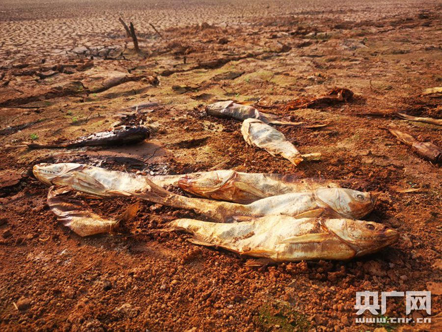 5月下旬,在陸良縣小百戶鎮(zhèn),有著60萬方庫容的黑泥溝水庫已經(jīng)干涸見底,底部的泥土全部開裂,就像微縮密布的裂谷!傲压取敝,是早已被曬干的死魚,空空的眼洞一側(cè)“望”著天空,一側(cè)望著曾棲息過的庫底。陸良縣水務(wù)局副局長劉桂林說:“這么多年來這個水庫從來沒有出現(xiàn)干涸的情況,即便是在2010年最干旱的時候都沒有出現(xiàn)過。但是今年因為氣溫非常高,加上‘厄爾尼諾’現(xiàn)象,水庫就干到見底了!弊鳛樵颇系霓r(nóng)業(yè)大縣,持續(xù)的高溫少雨天氣已經(jīng)導(dǎo)致陸良全線26件小(二)型水庫、74件小壩塘及2160個小水窖干涸。