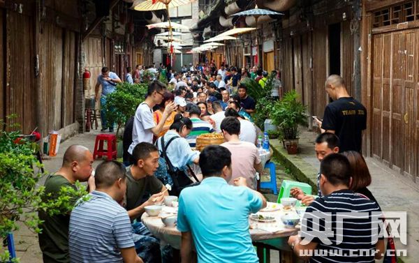 6月6日,大同古鎮(zhèn)上的游客與當?shù)厝罕娨黄鸸捕榷宋绻?jié)。(央廣網(wǎng)發(fā) 赤水市融媒體中心提供圖片)