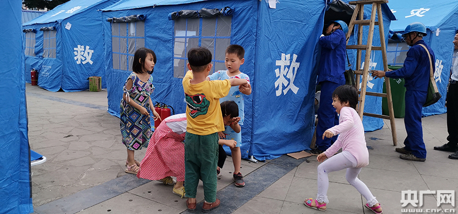 地震中心雙河鎮(zhèn)安置點,幾個孩子在玩鬧(央廣網(wǎng)記者 劉濤 攝)