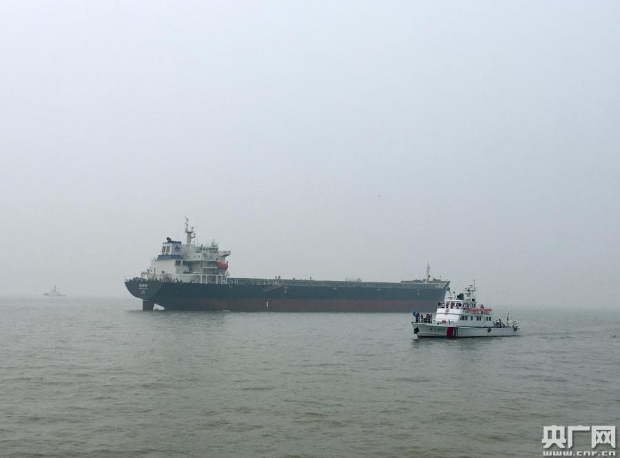 演習現(xiàn)場,兩艘救援船在協(xié)助“神華505”滅火。(央廣網(wǎng)見習記者 張曉琳 攝)