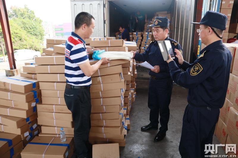 汕頭港海關(guān)關(guān)員查驗(yàn)進(jìn)口凍魷魚(yú)。(央廣網(wǎng)發(fā) 黎逸穎攝)