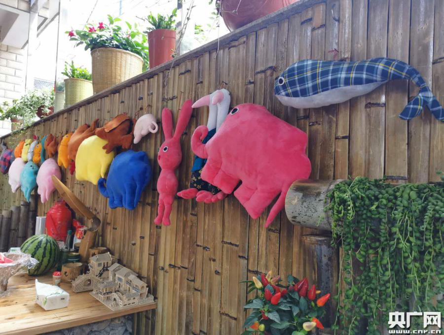 叢志強(qiáng)教授團(tuán)隊(duì)不僅自己動(dòng)手設(shè)計(jì),還手把手教村民設(shè)計(jì)。在短短幾天的培訓(xùn)和藝術(shù)熏陶下,當(dāng)了一輩子農(nóng)民的村民藝術(shù)感突然被激發(fā)。村民葉仙絨受到叢教授啟發(fā),自辦了“仙絨美術(shù)館”。她把兒子、孫子、外甥的書法作品,還有老底子留下的千工床、娘家陪嫁過來的“十里紅妝”等物件陳設(shè)在自己的美術(shù)館里,成了村里的一個(gè)參觀點(diǎn)。村民袁小仙則搬出了自己多年不用的縫紉機(jī),開始做各種毛絨玩具。游客走進(jìn)袁小仙家,馬上就被墻壁上形態(tài)各異的毛絨玩具所吸引!斑@些都是叢教授和他的學(xué)生教我的,我現(xiàn)在做毛絨玩具越來越熟練了,下步打算教給村里人!