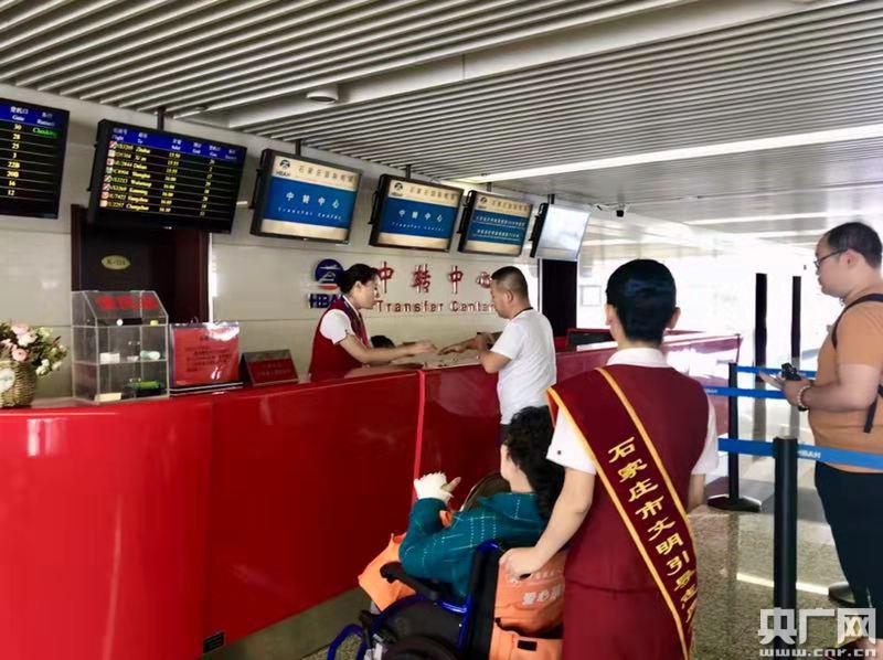 石家莊機(jī)場中轉(zhuǎn)中心工作人員正在為旅客辦理中轉(zhuǎn)服務(wù)(央廣網(wǎng)見習(xí)記者 閆金楓 攝)
