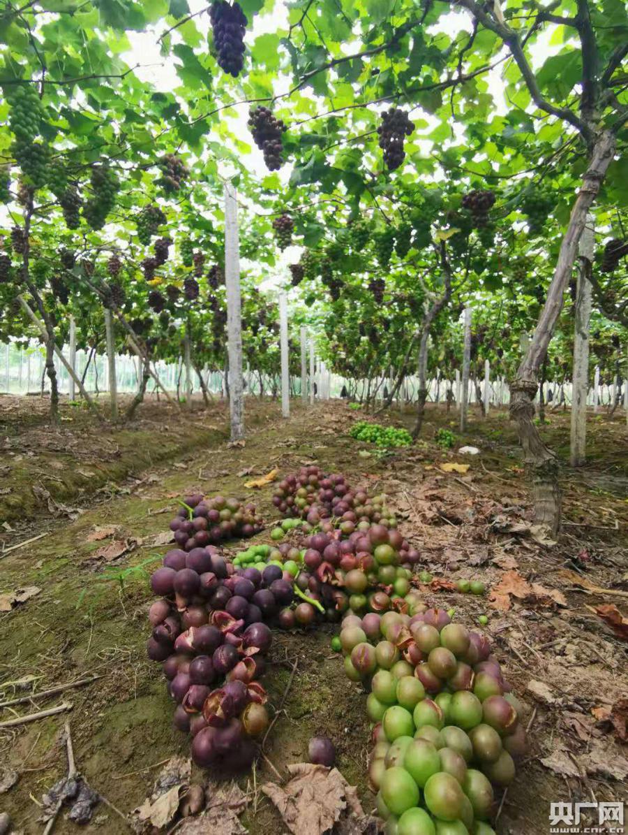 地上掉落的成串葡萄(央廣網(wǎng)記者 曹美麗 攝)