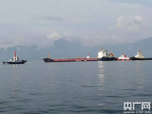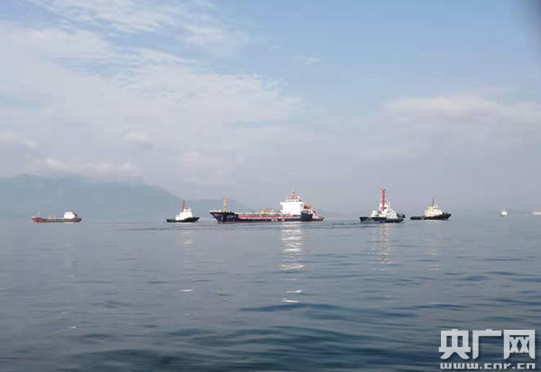失控船“常豐油12”輪在四艘拖輪拖帶、海事執(zhí)法船全程護(hù)航下起錨進(jìn)港。(圖片由惠州海事局提供)