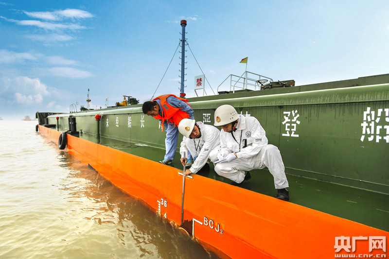 檢查船舶吃水情況。(央廣網發(fā) 長江海事局供圖)