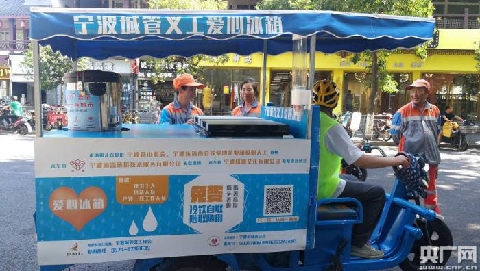“冰箱里的水和冷飲是免費提供給所有戶外工作者的!睂幉ǔ枪芰x工協(xié)會專職副秘書長陳澤州說,“愛心冰箱”項目始于2018年,由寧波城管義工協(xié)會聯(lián)合寧波市慈善總會發(fā)起,目的是給環(huán)衛(wèi)工等城市戶外工作者送去一份清涼。