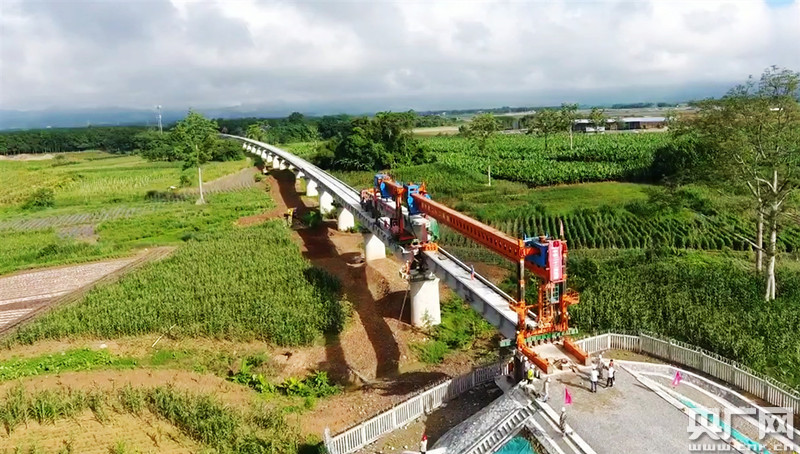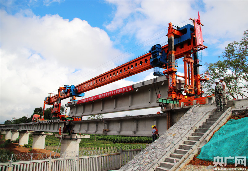 8月6日上午,中老昆萬鐵路國內(nèi)段第一長橋——橄欖壩特大橋架通。(央廣網(wǎng)發(fā) 李軍濤 攝)