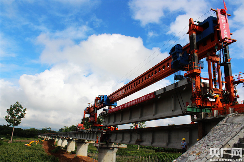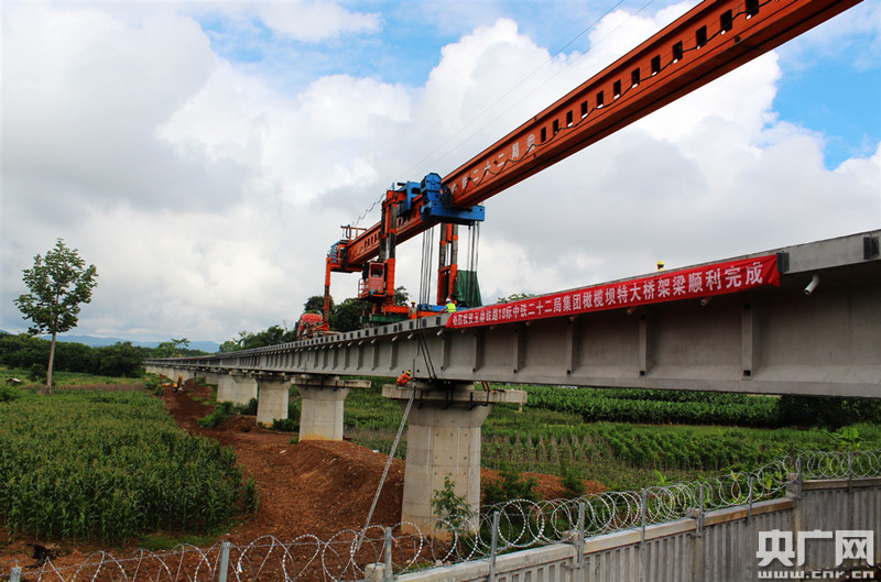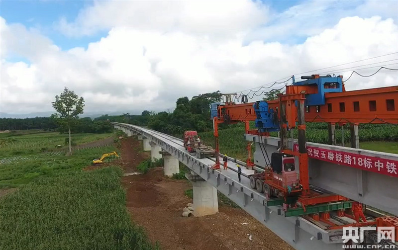 “橄欖壩特大橋全長3.5公里,共有墩臺(tái)108個(gè),于今年3月底開始T梁鋪架,經(jīng)過4個(gè)月的奮戰(zhàn)順利架通,為后續(xù)橋梁附屬設(shè)施建設(shè)和鋪軌創(chuàng)造了有利條件!8月6日上午,現(xiàn)場指揮橋梁架設(shè)的中鐵二十二局集團(tuán)玉磨鐵路項(xiàng)目部二分部經(jīng)理魏利輝說。