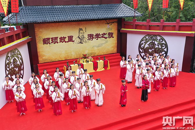 上午9時(shí)許,伴隨贊禮官的吟唱聲和古樂(lè)聲,表演隊(duì)伍入場(chǎng)。在凈手啟香、對(duì)顓頊行三揖禮之后,40名學(xué)生齊聲誦讀論語(yǔ),表達(dá)崇文上進(jìn)及尊師之意。