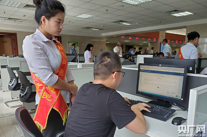 工作人員指導市民網(wǎng)上辦理(央廣網(wǎng)記者 徐升 攝)