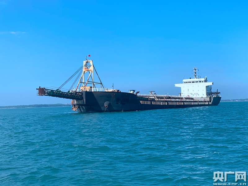 經(jīng)檢查,該船長(zhǎng)約139米,寬約21米,未涂刷船名船號(hào),隨船無任何船舶證書、采礦許可證及海域使用權(quán)證書等相關(guān)證件,涉嫌非法盜采海砂,海警執(zhí)法人員當(dāng)即依法查扣該船。