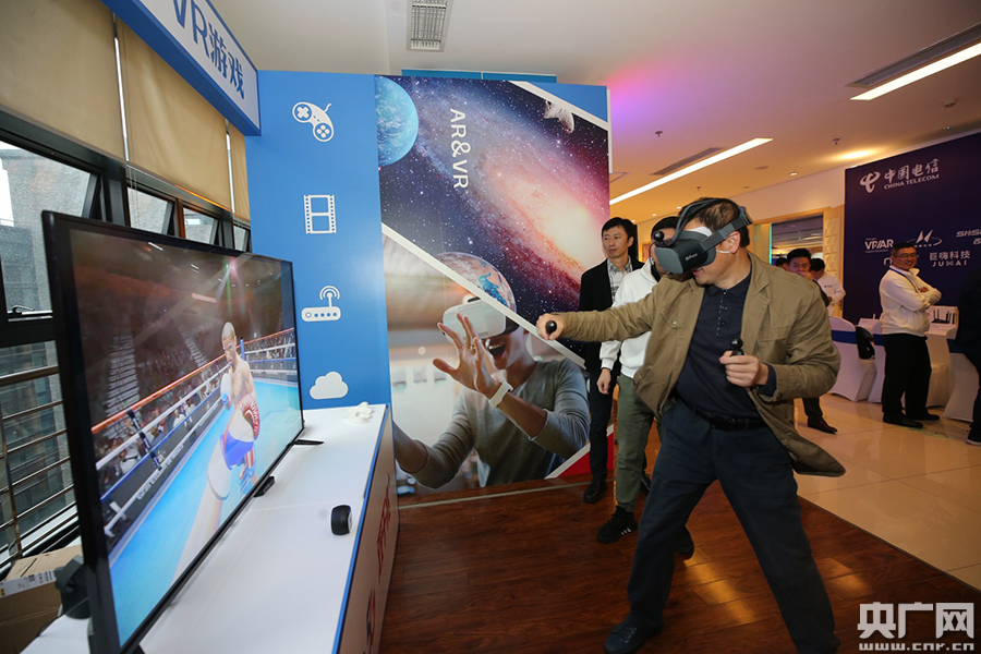 參會(huì)嘉賓體驗(yàn)電信5GVR游戲(央廣網(wǎng)發(fā) 中國(guó)電信供圖)