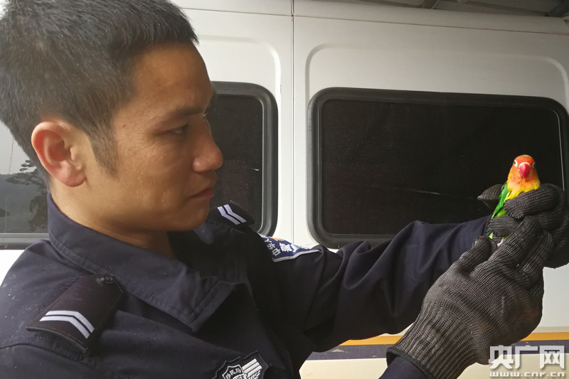民警正在對鸚鵡進行初步檢查(央廣網(wǎng)發(fā) 通訊員戴秋云 攝)