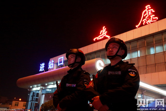 2019年12月31日晚兩名特警隊員在陜南安康火車站廣場立崗(央廣網(wǎng)發(fā) 郝黎俊 攝)