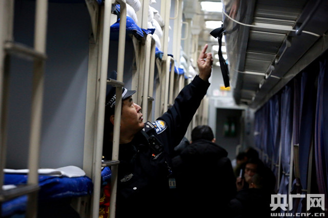 2019年12月31日晚乘警長衛(wèi)志軍在臥鋪車廂巡視提醒旅客將行李架上的背包安全擺放(央廣網(wǎng)發(fā) 郝黎俊 攝)