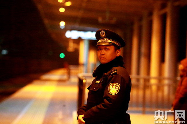 2019年12月31日晚鎮(zhèn)安車站站臺上新警田磊立崗(央廣網(wǎng)發(fā) 郝黎俊 攝)