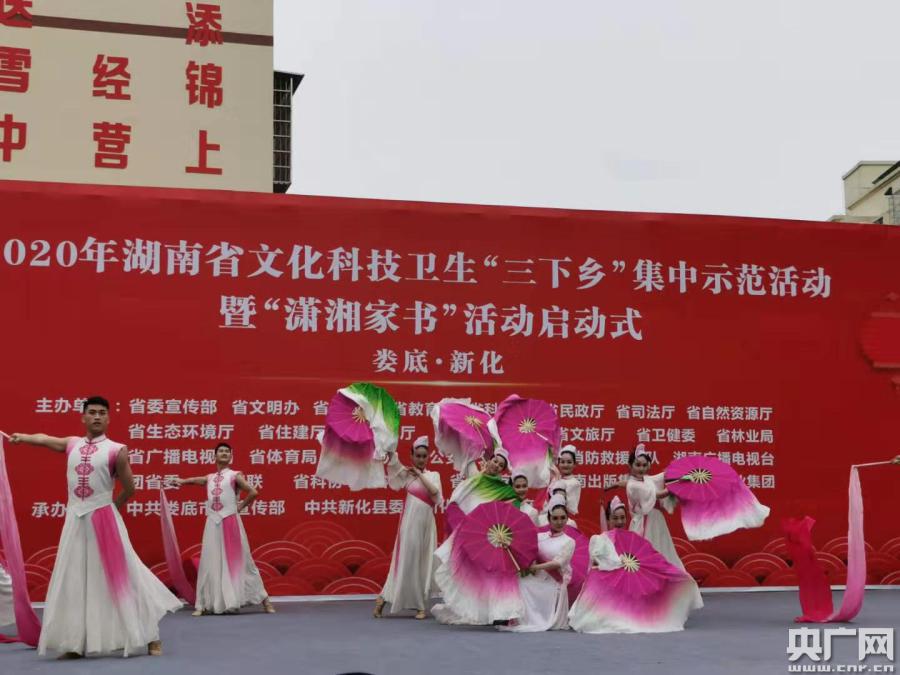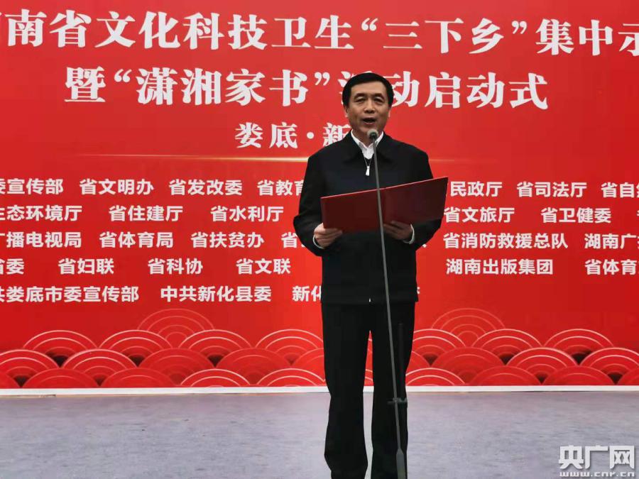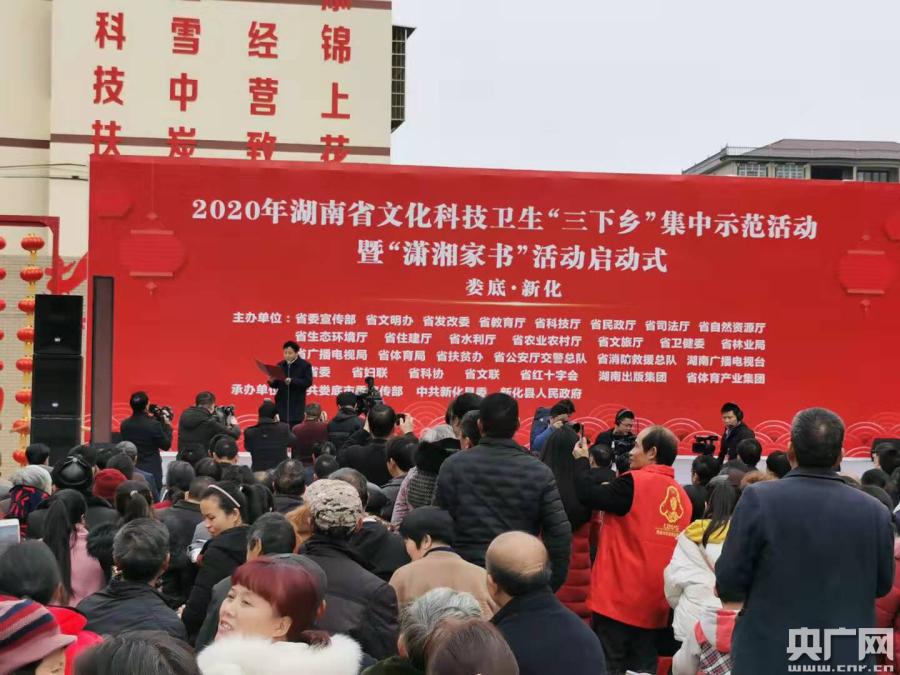 央廣網(wǎng)長沙1月9日消息(記者鄧文輝)1月8日下午,2020年湖南省文化科技衛(wèi)生“三下鄉(xiāng)”集中示范活動暨“瀟湘家書”活動啟動式,在湖南新化縣槎溪鎮(zhèn)朝陽村易地扶貧安置點舉行。