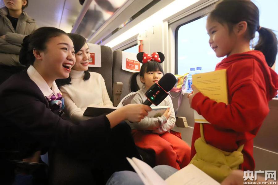 這場豐富多彩的圖書漂流活動吸引了廣大旅客的踴躍加入。有旅客從前排座椅后的袋子里取出“漂流書”,并受邀翻開書的任意一頁進行朗誦。和朋友一起帶孩子出行的陳女士接過工作人員送上的公仔和圖書,高興地說:“這次帶孩子去北京玩,很高興在火車上遇上這個活動,讓我感受到了濃濃的年味和有意義的旅途!