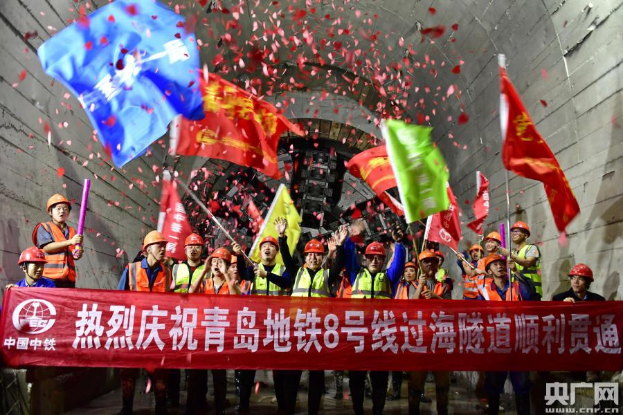施工人員在慶祝青島地鐵8號線過海隧道貫通(央廣網(wǎng)發(fā) 中鐵一局宣傳部供圖)