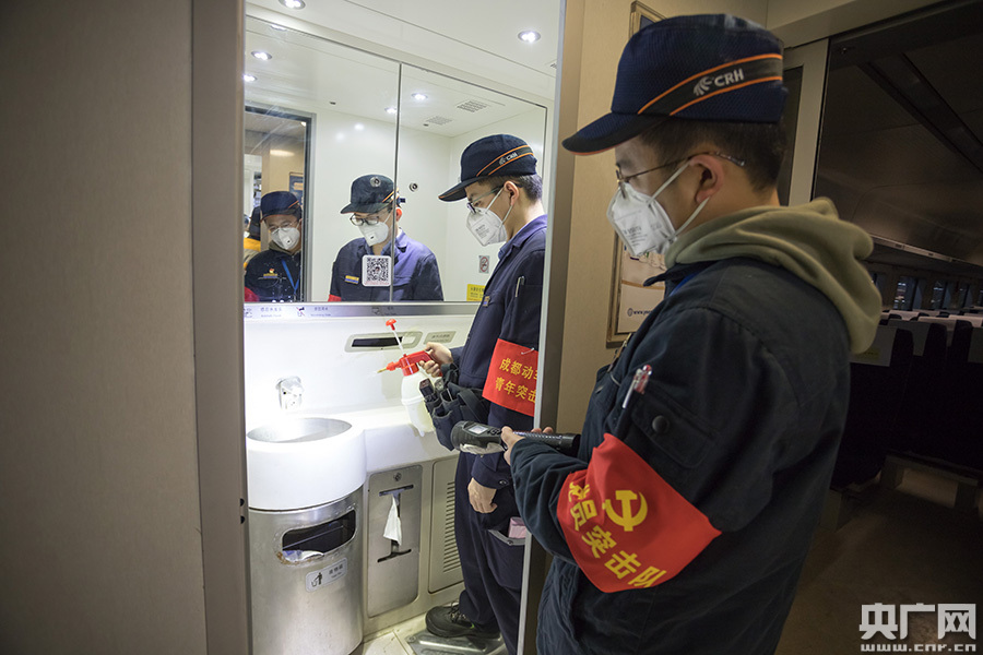 中國鐵路成都局集團有限公司成都動車段運用車間90后副工長樊楊和往常一樣帶領成都鐵路疾控中心的防疫人員在檢修庫內對一列列動車組進行消毒。其中一列動車組曾運載過疑似新型冠狀病毒感染肺炎疫情的旅客,他們仔細地對整列車的每個部位都進行消毒處理,消毒結束后,捂在防護服內的冬季作業(yè)服已經(jīng)被汗水浸透。