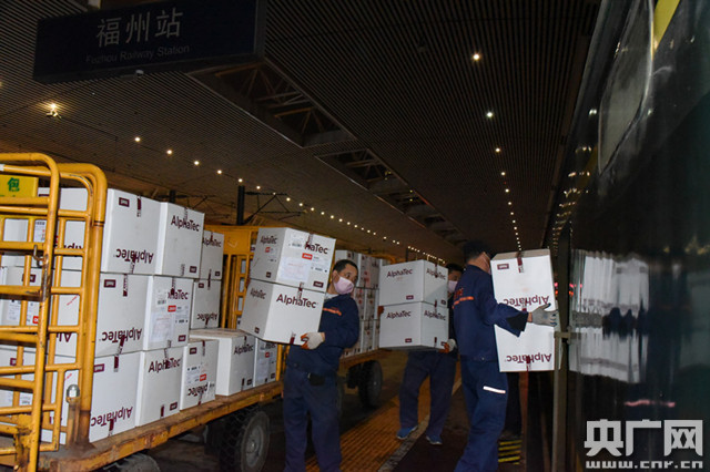 將支援湖北醫(yī)用防護(hù)服裝運(yùn)上K804次列車。(央廣網(wǎng)發(fā) 福州火車站供圖)