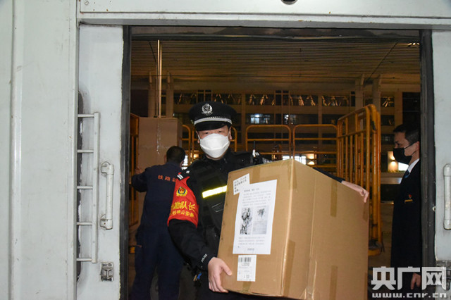 駐站民警協(xié)助裝載支援湖北醫(yī)用防護(hù)服。(央廣網(wǎng)發(fā) 福州火車站供圖)