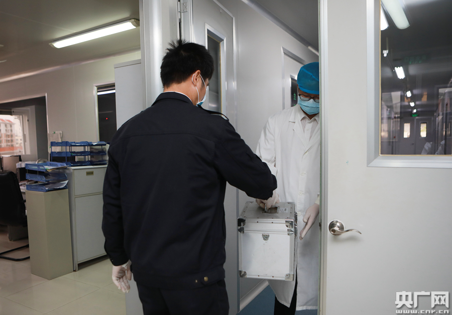 2月6日下午2:05,港珠澳大橋海關(guān)送來高風(fēng)險(xiǎn)旅客的取樣樣本。病毒樣本放置在專用運(yùn)輸箱內(nèi),汪博士走到門口接過樣本。