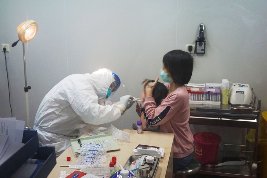 關(guān)員對(duì)境外確診新冠肺炎出院后入境旅客及其同行人進(jìn)行流行病學(xué)調(diào)查及咽拭子取樣(攝影:黃孝洵)
