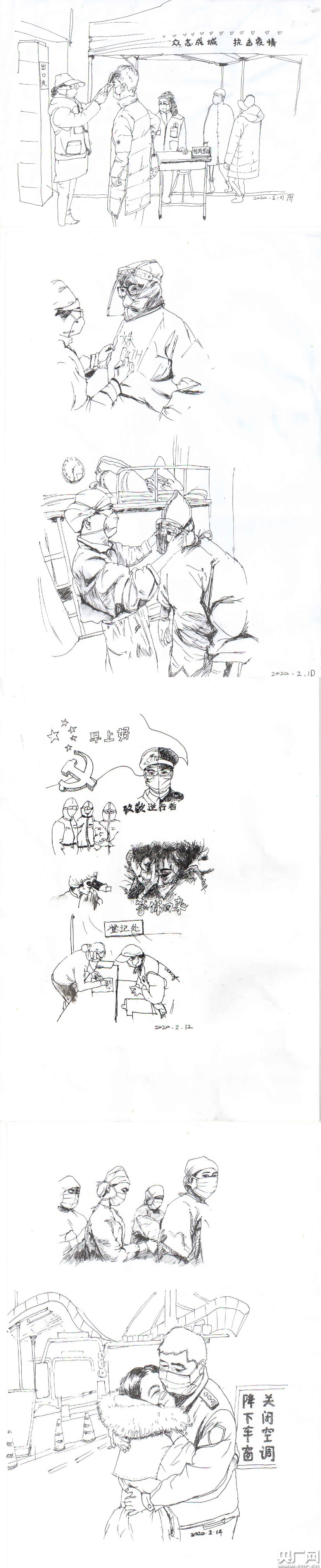 其實,馮慧還畫了好組漫畫,有的寥寥數筆勾勒出醫(yī)護人員“逆行”戰(zhàn)“疫”的畫面,有的致敬醫(yī)護人員忙碌瞬間,更多的內容來自日?ǹ诘恼鎸崍鼍,溫馨的圖案記錄下轄區(qū)小區(qū)卡口認真檢測、登記的社區(qū)工作者和志愿者們。自疫情發(fā)生以來,馮慧和同事們一直堅守在疫情防控的一線,她和其他社工一樣,每天街頭巷尾宣傳、走樓入戶摸排、卡口站點防控。