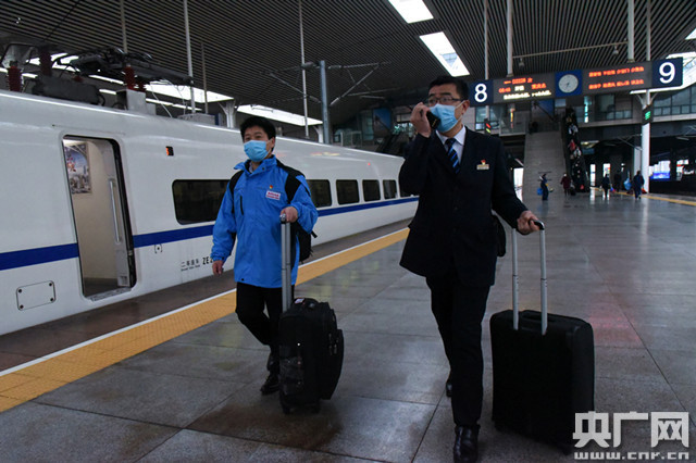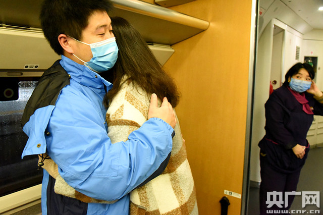 央廣網(wǎng)福州2月15日消息(記者張子亞 通訊員張貴鋒 王婷 江曲)“走吧,走吧,一定要保重好自己!备V菡菊九_上,新婚不久的李蓮花揮著不舍的雙手為夫送行,鏡框里的淚水還是忍不住滴落下來。2月15日8時40分,福州火車站開辟“綠色通道”,為福建省立醫(yī)院支援武漢抗疫的陳建華一路送行,在開往重慶的動車即將啟程之際,李蓮花與丈夫陳建華依依道別。