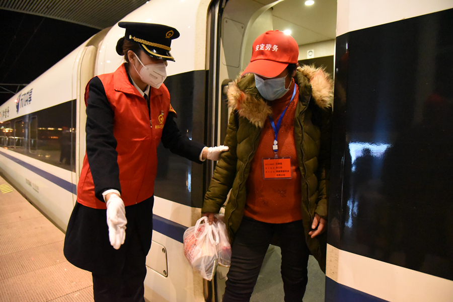 “來,大家保持寬松距離,從這邊走!闭九_(tái)上,車站工作人員組織務(wù)工人員有序出站。從專用通道出站時(shí),紅外線測(cè)溫儀不斷跳動(dòng)著人們的影像和體溫溫度。來自甘肅的定西寺溝鄉(xiāng)紙坊村的包軍紅說:“在老家一直發(fā)愁上班的事情,乘坐什么交通工具?旅途是否安全?回單位是不是順利?真沒想到考慮的這么周到,免費(fèi)讓我們回來;沒想到鐵路部門這么用心服務(wù),為我們開行了高鐵專列;沒想到福州火車站和列車工作人員熱忱服務(wù),為我們做好個(gè)人防護(hù)!卑娂t的三個(gè)沒想到讓一旁的務(wù)工人員紛紛豎起了大拇指。