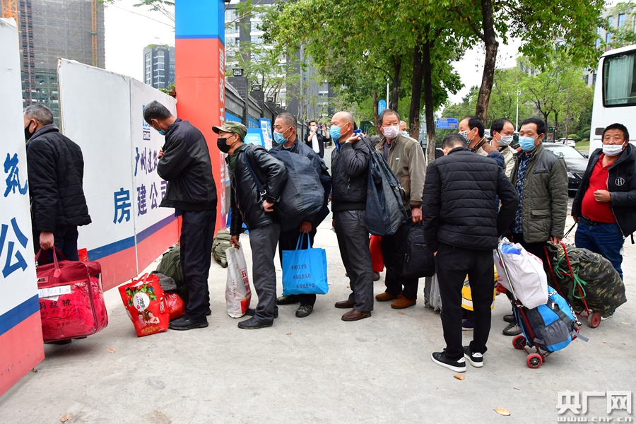 一輛滿載返崗工人的大巴駛向黃埔區(qū)(央廣網(wǎng)發(fā) 通訊員供圖)