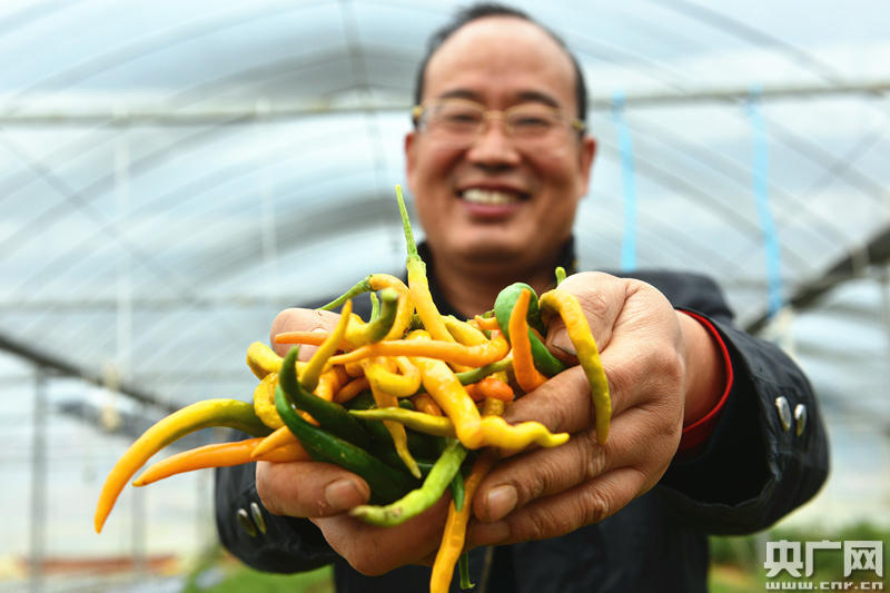 湖南衡東吳集鎮(zhèn)紅坪村楓仙嶺蔬菜基地負責(zé)人展示剛剛采摘的黃貢椒(央廣網(wǎng)發(fā) 肖亞輝攝)