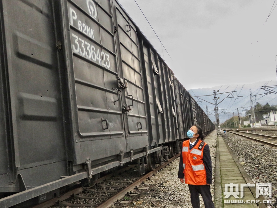 白濤站貨運(yùn)主任韓曉華正在巡視檢查貨物反面車(chē)門(mén)關(guān)閉情況(央廣網(wǎng)發(fā) 通訊員供圖)